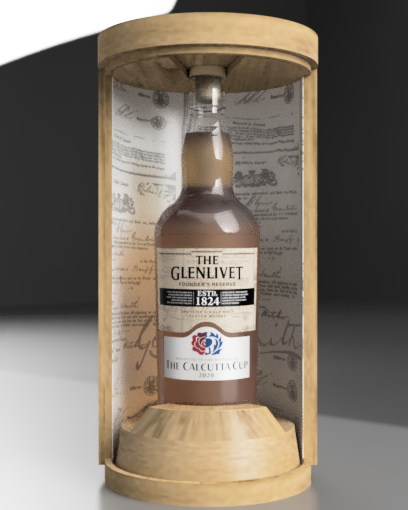 The gift product, a bottle holder/ornamental rugby tee, would sit inside the box to present the bottle as the user opened the box. The final part of the design, the bottle label, was inspired by The Calcutta Cup itself as well as the traditionalist origins of The Glenlivet whisky brand.